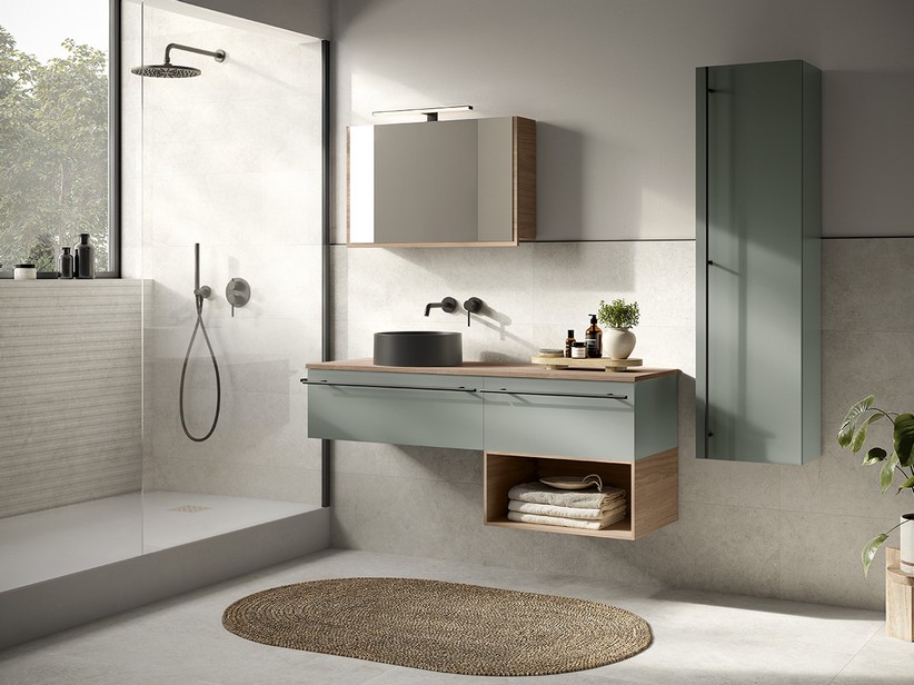 Badezimmermöbel LUMI L140 cm mit 2 Schubladen, Ausführung Nussbaum/mattgrün mit Holzoptik-Aufsatz in Nussbaumporenoptik