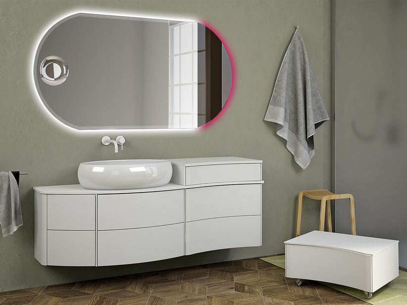 OLAS Waschbeckenunterbau cm 152 links gewölbt aus kratzfestem weißem mattem Laminat und Seitenteilen aus mattem weißem Acrylstein - innen mit Stoffoptik - 2 Schubladen mit Schließdämpfung - gewölbter seitlicher 2-türiger Unterbau mit Schließdämpfung und Stoffoptik innen - gewölbter seitlicher Unterbau mit 2 Schubladen mit Schließdämpfung und Stoffoptik innen - Platte cm 152x49 weiß matt - Schmuckkasten
